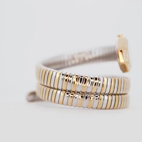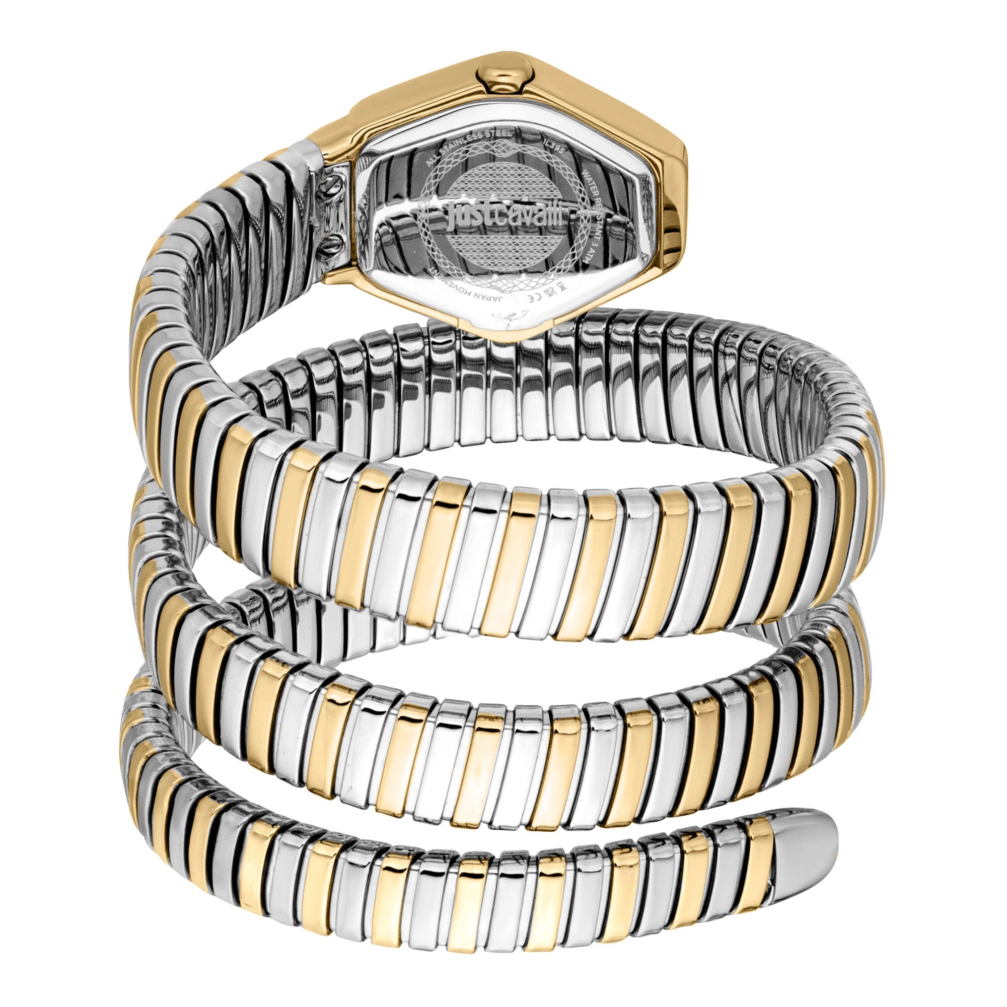 The unique two-tone stainless steel band, showcasing both silver-grey and yellow gold IP plating, intricately wraps around the wrist, echoing the renowned snake motif of the Just Cavalli Signature Snake family. This design detail ensures a luxurious feel and a secure fit, making it a perfect women's fashion watch.