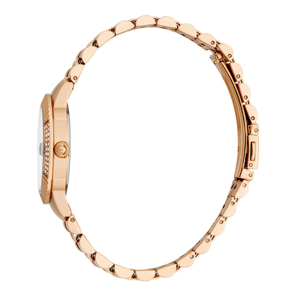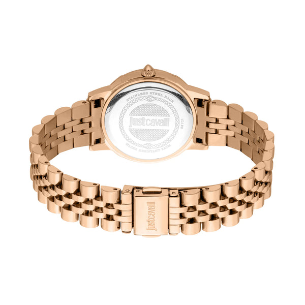 Just Cavalli Glam w różowym złocie to wizja ponadczasowego piękna. Jego okrągła koperta i antycznie biała tarcza odzwierciedlają szykowną filozofię marki, podczas gdy stalowa bransoleta i zapięcie motylkowe zapewniają bezproblemowe połączenie elegancji i nowoczesności.