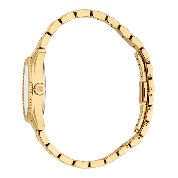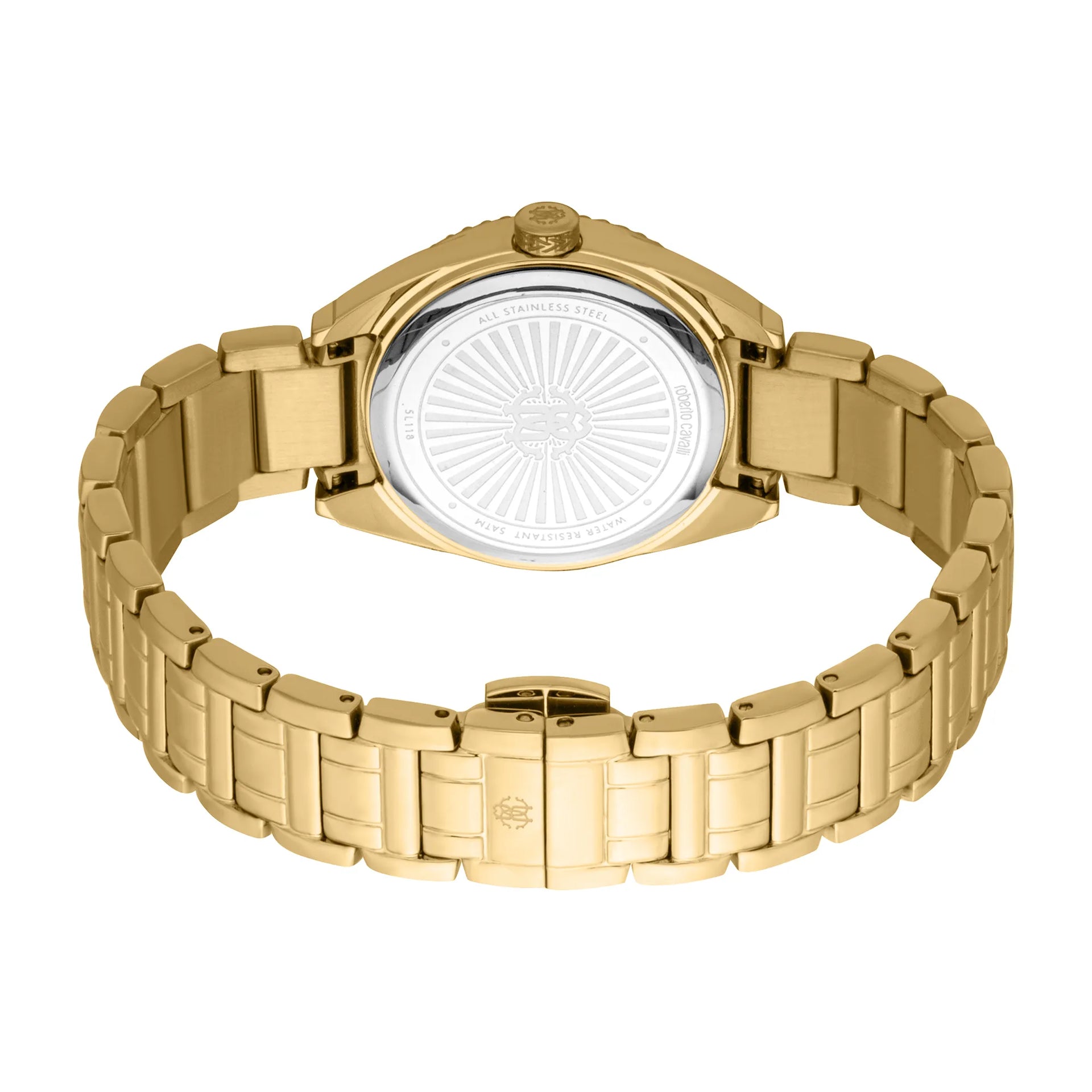 W świecie wysokiej mody, gdzie elegancja spotyka się z innowacją, pojawia się zegarek, który ucieleśnia istotę wyrafinowania i stylu. Wykonany w sercu szwajcarskiego zegarmistrzostwa, ten zegarek Roberto Cavalli Lady jest świadectwem zaangażowania marki w luksus i precyzję. Jego okrągła koperta, skąpana w bogatym odcieniu żółtego złota, łapie światło przy każdym ruchu, tworząc olśniewający pokaz wyrafinowania. Z średnicą koperty 30 mm, leży z gracją na nadgarstku, będąc idealnym połączeniem subtelności i wyrazu. Mineralne szkiełko chroni srebrno-szary cyferblat, na którym trzy wskazówki tańczą w doskonałej harmonii, napędzane niezawodnym mechanizmem kwarcowym GL32. Bransoleta ze stali nierdzewnej, również w żółtym złocie, oplata nadgarstek z zapięciem motylkowym, zapewniając zarówno bezpieczeństwo, jak i wygodę noszenia. Wodoodporny do 50 metrów, ten zegarek jest tak praktyczny, jak i piękny, gotowy towarzyszyć Ci w życiowych przygodach. Koronka typu pull & push dodaje klasycznego uroku, zapraszając do łatwej regulacji czasu. Ten zegarek Roberto Cavalli Lady to więcej niż tylko czasomierz, to symbol ponadczasowej elegancji, odzwierciedlenie gracji i siły nowoczesnej kobiety, przeznaczony, by być cenionym towarzyszem w jej życiowej podróży.