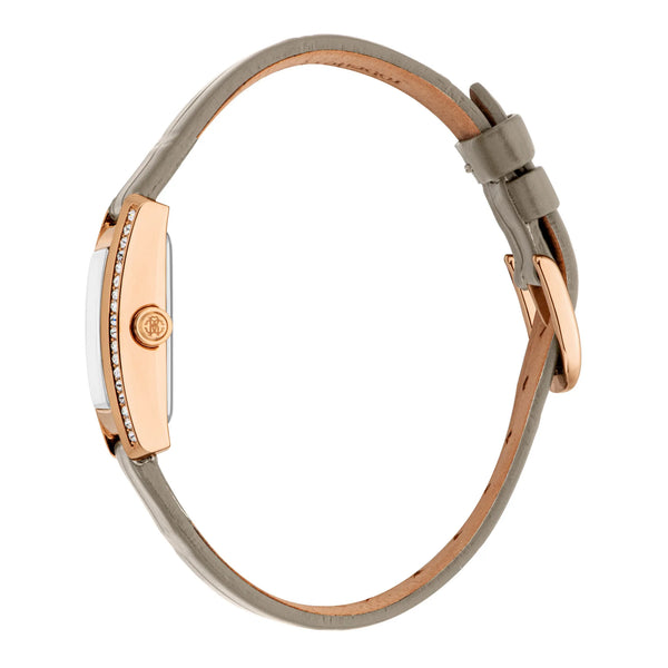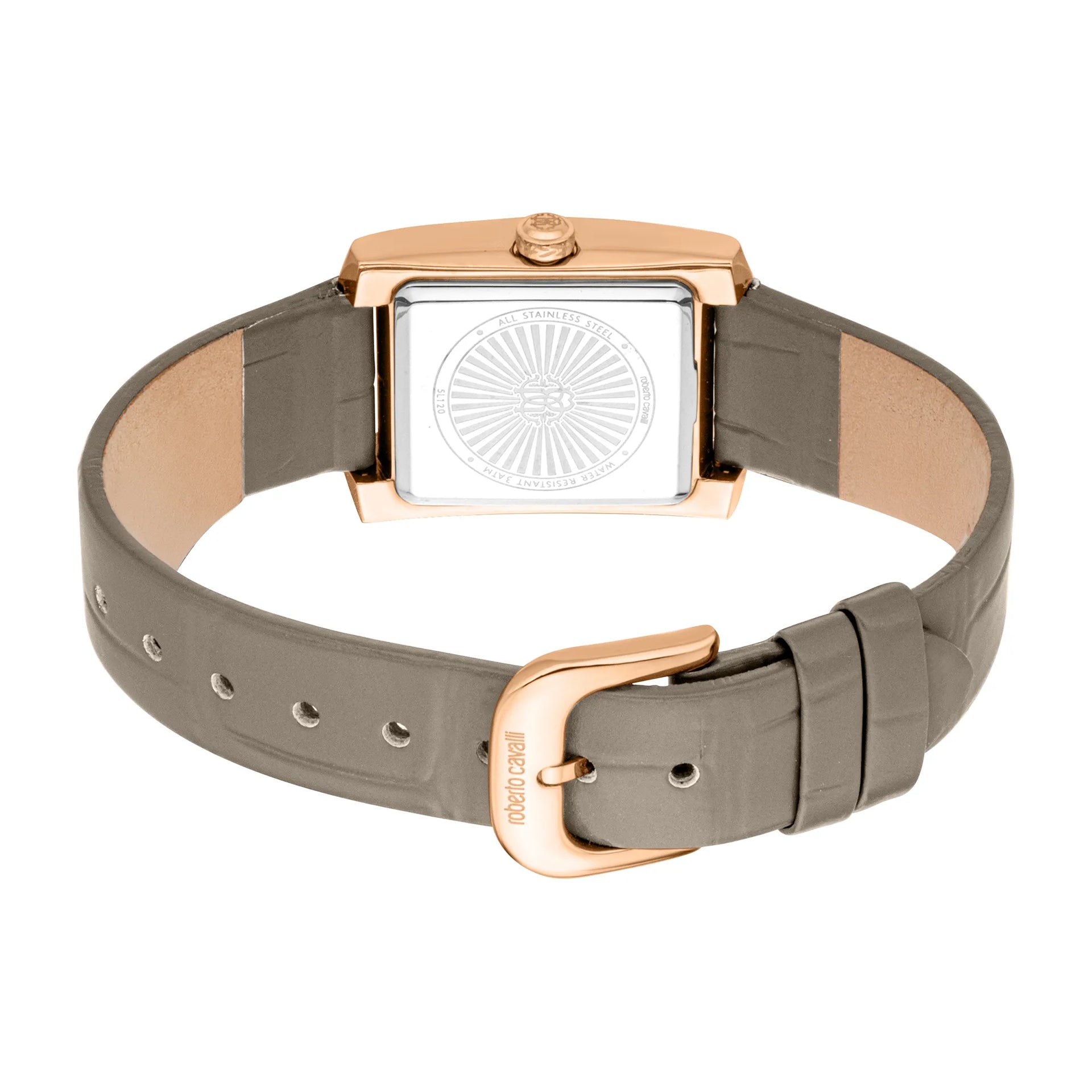 W świecie mody, gdzie elegancja spotyka się z innowacją, pojawia się zegarek, który uchwyca istotę wyrafinowania i stylu. Wykonany w sercu szwajcarskiego zegarmistrzostwa, ten zegarek Roberto Cavalli Lady jest świadectwem wyrafinowanego designu i doskonałego rzemiosła. Prostokątna koperta, skąpana w luksusowym odcieniu różowego złota, emanuje ponadczasowym urokiem, doskonale uzupełniając delikatne nadgarstek nowoczesnej kobiety. Jego mineralna szafirowa tarcza oferuje wyraźny widok na srebrno-szarą tarczę, gdzie trzy wskazówki tańczą z gracją, napędzane precyzją mechanizmu kwarcowego z kalibrem GL34. Jasnoszary skórzany pasek, zabezpieczony klamrą na szpilkę, wygodnie owija się wokół nadgarstka, dodając odrobinę subtelnej elegancji każdej stylizacji. Wodoodporny, ten zegarek jest tak samo praktyczny, jak piękny, gotowy towarzyszyć Ci w życiowych przygodach. Koronka typu pull & push zapewnia łatwą regulację czasu, czyniąc go niezawodnym towarzyszem dla kobiety podążającej za modą. Dzięki harmonijnemu połączeniu kolorów i materiałów, ten zegarek Roberto Cavalli Lady to nie tylko dodatek, ale wyraz stylu i gracji, przeznaczony, by zostawić trwałe wrażenie, gdziekolwiek się pojawi.