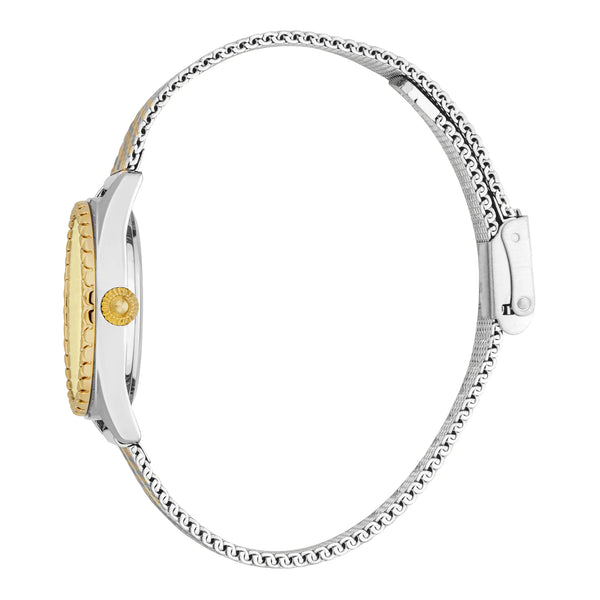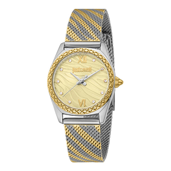 W świecie mody, gdzie elegancja spotyka się z odwagą, pojawia się zegarek, który uchwyca istotę wyrafinowania i śmiałości. Ten Just Cavalli Watch, z prestiżowej kolekcji Just Cavalli Animalier, jest świadectwem talentu marki do tworzenia elementów, które są zarówno odważne, jak i wyrafinowane. Wykonany z okrągłą kopertą w eleganckim srebrno-szarym odcieniu, emanuje subtelną, lecz uderzającą obecnością na nadgarstku. Średnica 30 mm jest idealnie proporcjonalna dla nowoczesnej kobiety, która ceni zarówno styl, jak i funkcjonalność. Jego wodoodporna cecha zapewnia, że pozostaje niezawodnym towarzyszem, bez względu na przygodę. Kryształ mineralny dodaje warstwę trwałości, podczas gdy koronka typu pull & push oferuje łatwość użytkowania. Pasek ze stali nierdzewnej, pokryty luksusowym żółtym złotem, owija się elegancko wokół nadgarstka, zabezpieczony regulowanym zapięciem typu slide dla idealnego dopasowania. Tarcza w kolorze szampana, z mechanizmem kwarcowym 3-wskazówkowym, jest ukłonem w stronę ponadczasowej elegancji, podczas gdy akcent kolorystyczny dodaje współczesnego charakteru, czyniąc go wyróżniającym się elementem każdej kolekcji. Ten zegarek to nie tylko dodatek, to wyraz charakteru i stylu, stworzony dla tych, którzy odważą się być inni.