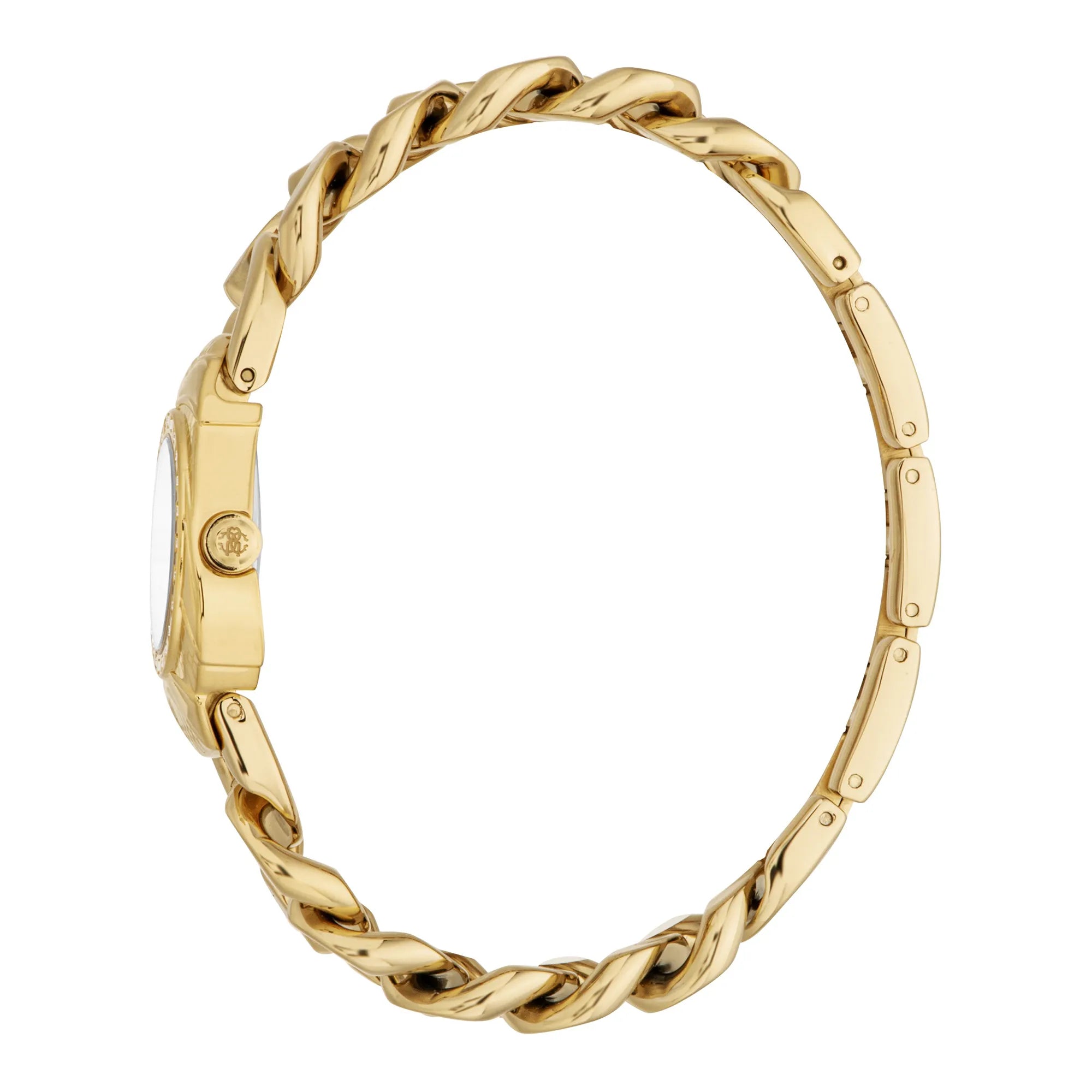 Promieniuj elegancją z zegarkiem Roberto Cavalli Lady w żółtym złocie. Jego nieregularna koperta i perłowo-biała tarcza oferują uderzający kontrast, podczas gdy stalowa bransoleta i zapięcie jubilerskie podkreślają jego luksusowy charakter. Wodoodporny i stworzony dla nowoczesnej kobiety, ten czasomierz jest symbolem ponadczasowego piękna.
