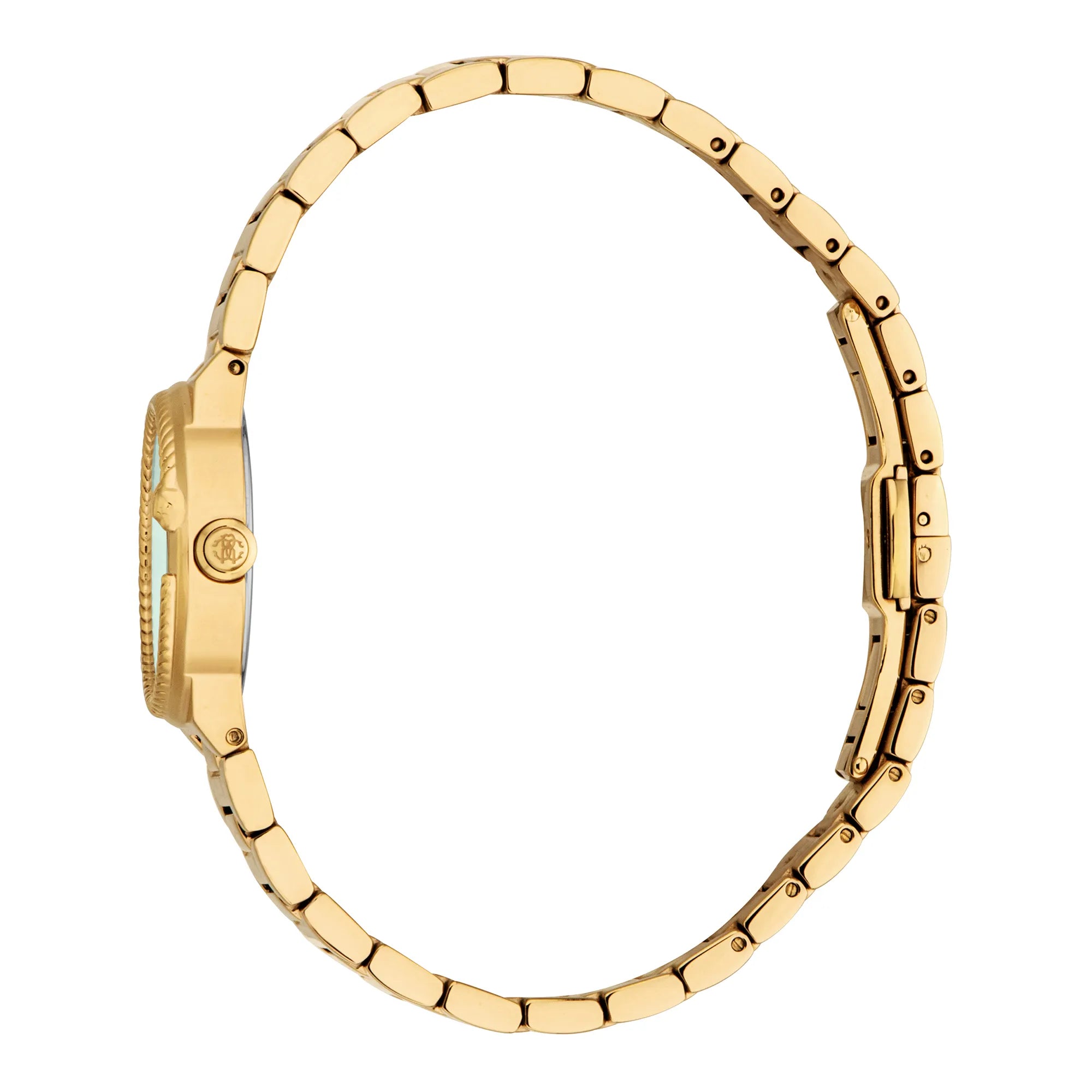 W świecie elegancji i wyrafinowania, gdzie czas nie jest tylko mierzony, ale celebrowany, pojawia się arcydzieło, które ucieleśnia istotę wyrafinowanego luksusu. Wykonany w sercu szwajcarskiej precyzji, ten zegarek Roberto Cavalli Lady jest świadectwem zaangażowania marki w modny design i wyśmienite rzemiosło. Okrągła koperta, skąpana w bogatym blasku żółtego złota, łapie światło przy każdym ruchu, tworząc taniec blasku na nadgarstku. Z średnicą koperty 26 mm oferuje delikatną, a zarazem uderzającą obecność, idealną dla nowoczesnej kobiety, która ceni subtelność z nutą wspaniałości. Mineralne szkło chroni butelkowozieloną tarczę, odcień, który szepcze o głębokich lasach i ponadczasowej elegancji, podczas gdy wyświetlacz z trzema wskazówkami, napędzany niezawodnym mechanizmem kwarcowym GL32, zapewnia precyzję w każdym tyknięciu. Bransoleta ze stali nierdzewnej, również w żółtym złocie, owija się wokół nadgarstka z poczuciem ciągłości i gracji, zabezpieczona zapięciem motylkowym z przyciskiem dla wygody i komfortu. Wodoodporny do 50 metrów, ten zegarek to nie tylko dodatek, ale towarzysz życiowych przygód, łączący funkcjonalność z modą. Prawdziwe ucieleśnienie wizji Roberto Cavalli, ten czasomierz to więcej niż zegarek, to manifest stylu, celebracja kobiecości i ukłon w stronę ponadczasowego uroku szwajcarskiego rzemiosła.