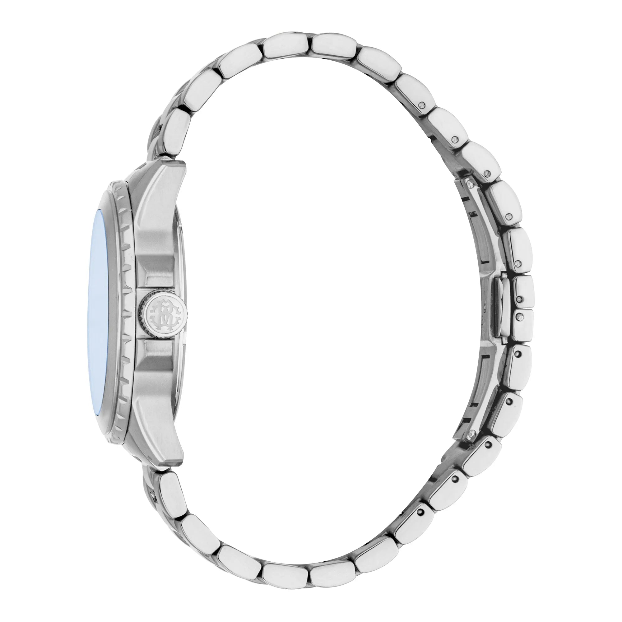 Zegarek Roberto Cavalli Gent to arcydzieło designu, z jego srebrno-szarym okrągłym kopertą i bransoletą ze stali nierdzewnej. Nocnoniebieska tarcza, zamknięta w szkle mineralnym, oferuje uderzający kontrast, czyniąc go fascynującym dodatkiem na każdą okazję.