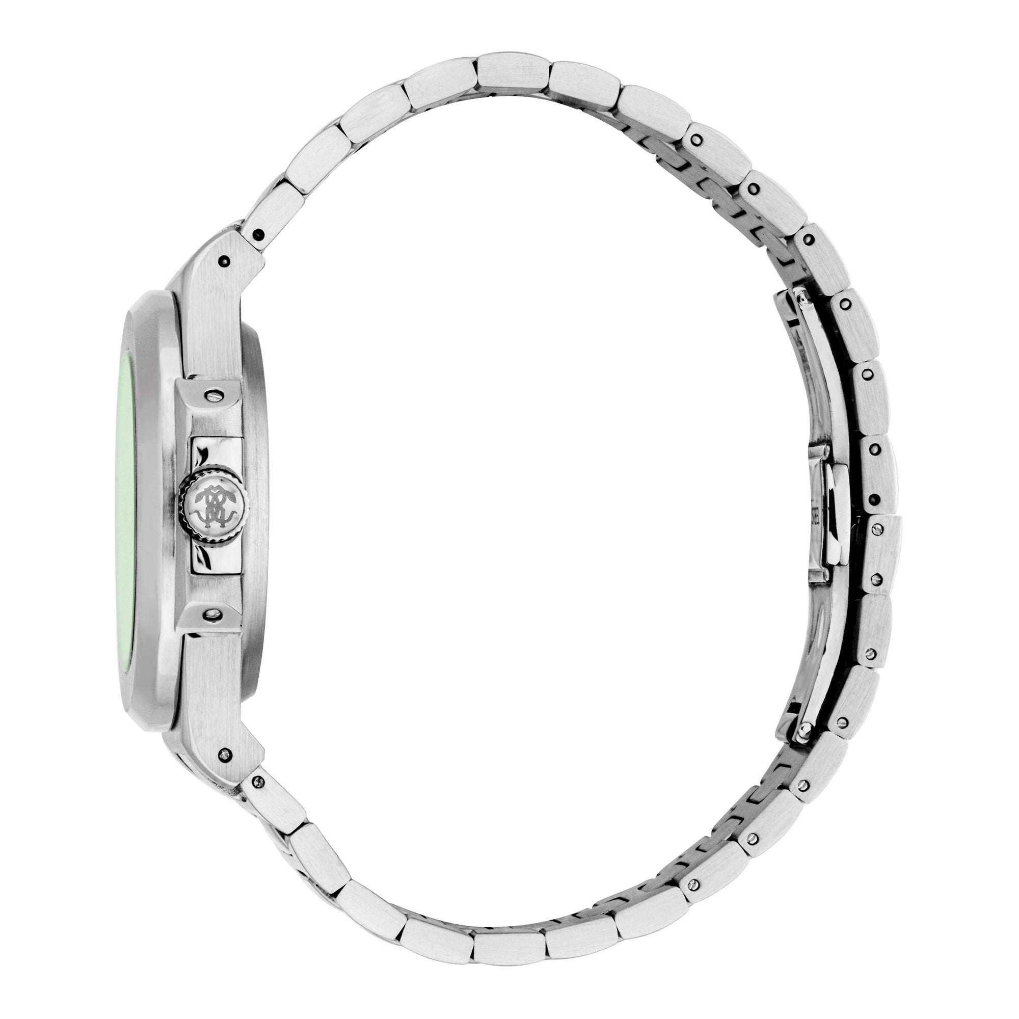 Crafted with a durable silver-grey stainless steel case, measuring a confident 43mm in diameter and 12mm thick, this Roberto Cavalli watch exudes elegance and presence. The classic round case shape is beautifully complemented by a vibrant bottle green dial, featuring luminous hands and indexes for exceptional readability in any lighting condition. A sturdy mineral crystal protects the dial, while the convenient pull & push crown allows for effortless time adjustments.