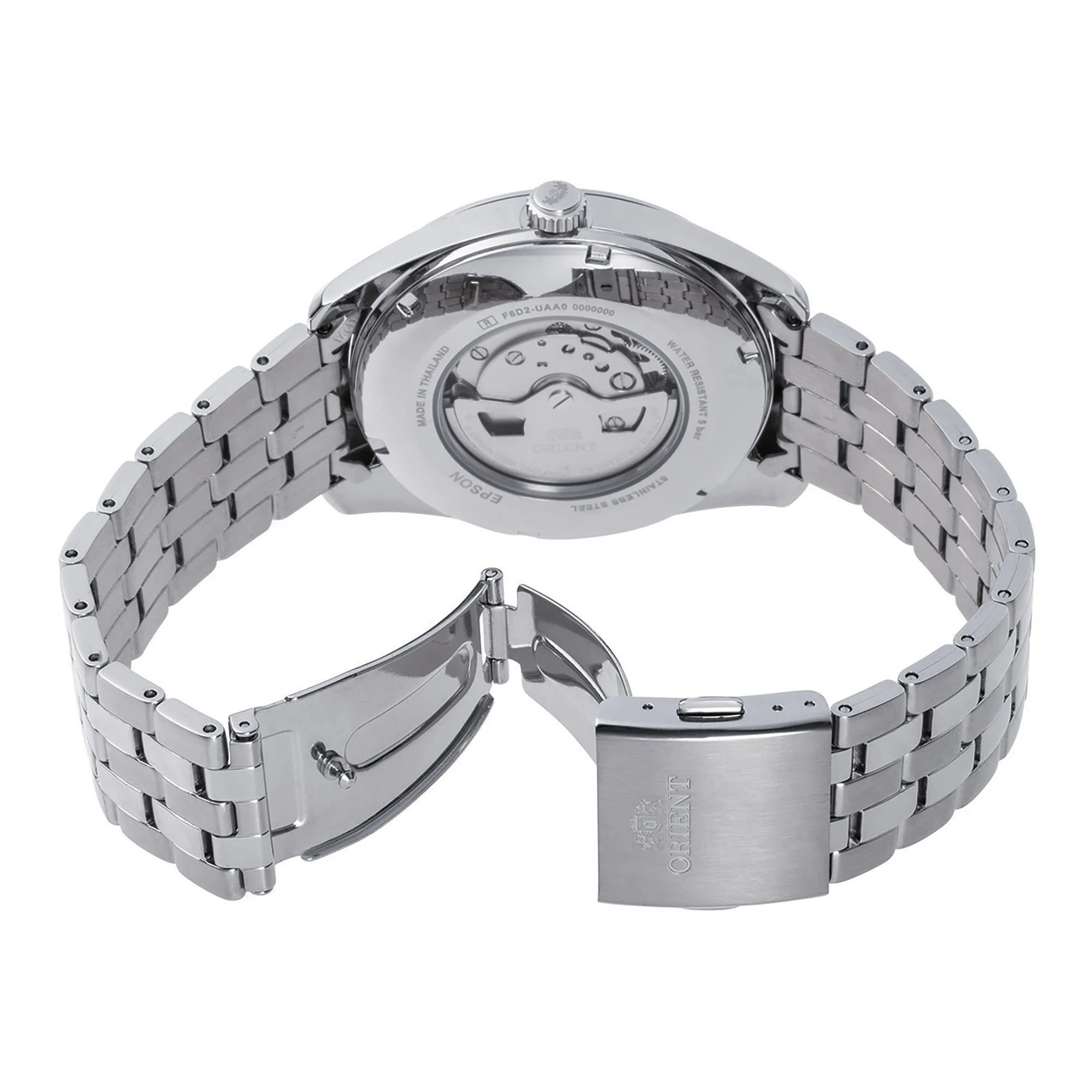 Przyjmij wyrafinowaną męskość z Orient Contemporary. Stworzony dla współczesnego mężczyzny, ten codzienny zegarek jest prawdziwym przedłużeniem twojej tożsamości. Jego urzekająca srebrno-szara tarcza dumnie prezentuje skomplikowany wieloletni kalendarz, oferując intuicyjną kontrolę nad każdą mijającą chwilą. Poczuj satysfakcjonującą wagę jego japońskiego automatycznego mechanizmu, świadectwo trwałej precyzji i dziedzictwa. To nie tylko zegarek, lecz powiernik twoich aspiracji. Wyobraź sobie, jak subtelnie błyszczy na twoim nadgarstku, cichy symbol ambicji, gdy pewnie pokonujesz dzień, od sali posiedzeń po nieoczekiwaną przygodę.