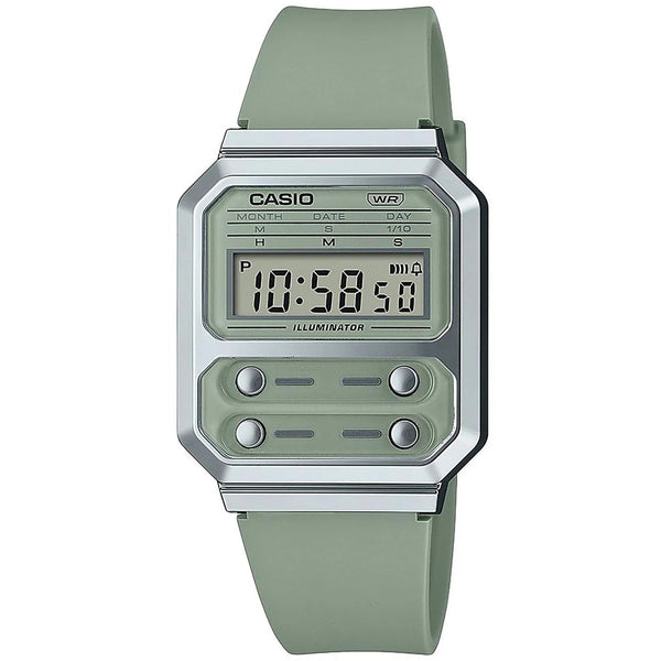 W świecie, gdzie czas jest zarówno luksusem, jak i koniecznością, zegarek CASIO Retro Vintage wyłania się jako latarnia ponadczasowego stylu i funkcjonalności. Wykonany w duchu lat 80., ten uniseksowy czasomierz uchwyca istotę swobodnej elegancji dzięki smukłej, prostokątnej kopercie wykończonej w wyrafinowanym srebrno-szarym kolorze. Wyrafinowany design zegarka uzupełnia żywa zielona gumowa opaska, dodając nowoczesnego akcentu jego vintage'owym korzeniom. Zielona tarcza, harmonijnie dopasowana do paska, oferuje wyrazisty kolor, który odzwierciedla odważnego i pełnego przygód ducha jego właściciela. Wyposażony w cyfrowy wyświetlacz, zegarek zapewnia precyzję dzięki mechanizmowi kwarcowemu, podczas gdy kalendarz z dniem, datą i miesiącem pozwala na łatwą organizację. Koronka typu pull & push oraz zapięcie na sprzączkę zapewniają łatwość użytkowania, czyniąc go praktycznym wyborem na co dzień. Wodoodporny i wyposażony w funkcję alarmu oraz podświetlenia, ten zegarek jest tak wszechstronny, jak stylowy, gotowy towarzyszyć Ci w każdej przygodzie. Niezależnie od tego, czy przemierzasz miejską dżunglę, czy cieszysz się spokojnym dniem, zegarek CASIO Retro Vintage jest Twoim idealnym towarzyszem, łączącym nostalgię z współczesnym urokiem w bezproblemowym tańcu czasu i stylu.