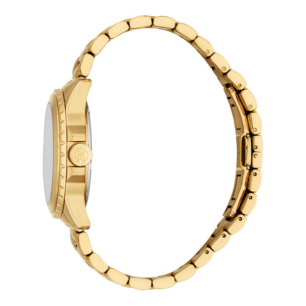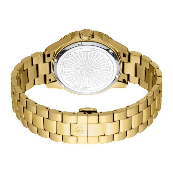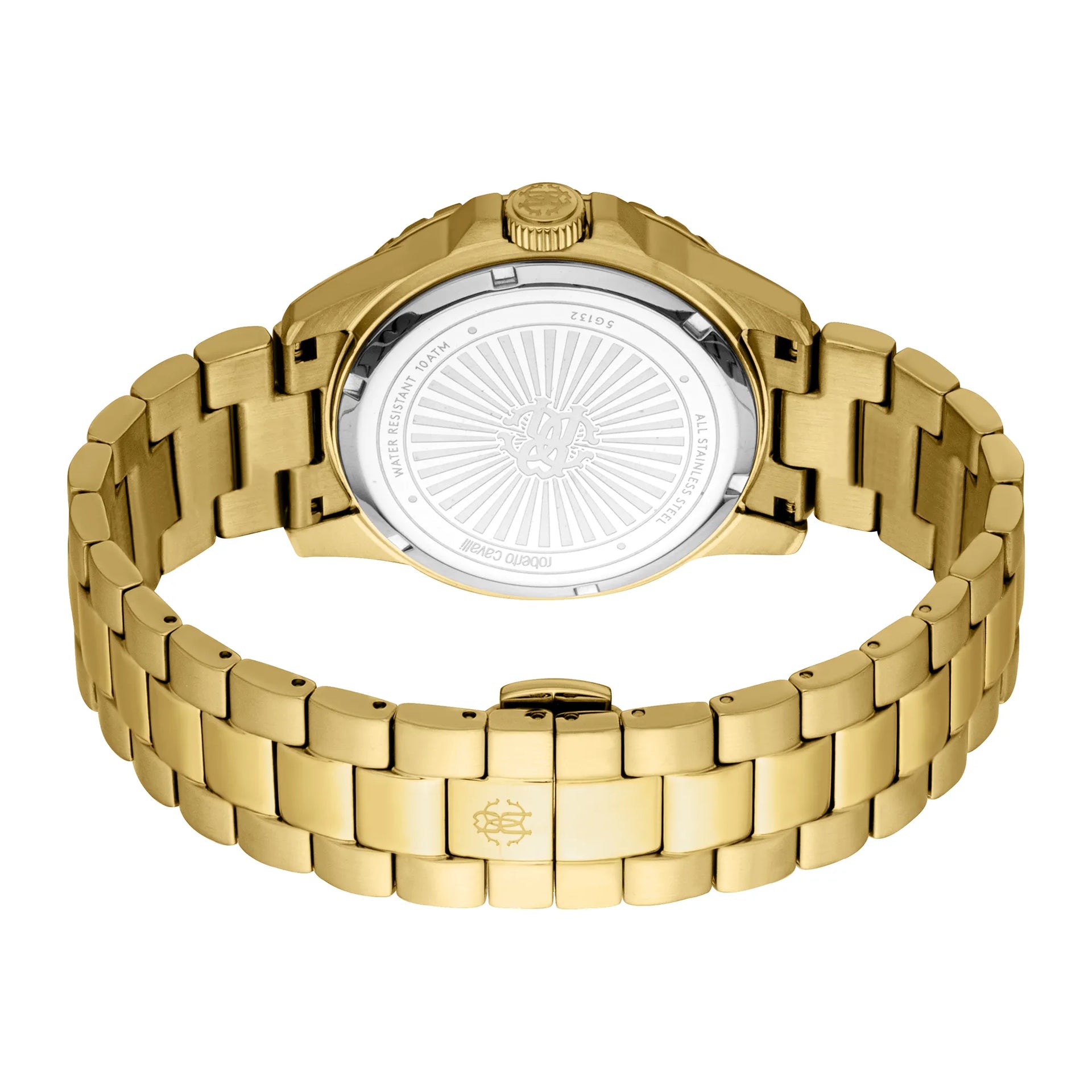 W świecie zegarmistrzostwa, gdzie elegancja spotyka się z precyzją, pojawia się zegarek, który ucieleśnia istotę wyrafinowania i stylu. Wykonany w sercu szwajcarskiego zegarmistrzostwa, ten zegarek Roberto Cavalli Gent jest świadectwem zaangażowania marki w doskonałość i modny design. Okrągła koperta, skąpana w luksusowym odcieniu żółtego złota, przyciąga wzrok swoim 40mm średnicą, emanując aurą przepychu i wspaniałości. Mineralna szafirowa tarcza chroni uderzającą czarną tarczę, gdzie sztuka odmierzania czasu jest prezentowana z precyzją kwarcową. Analogowy wyświetlacz, uzupełniony kalendarzem daty, zapewnia, że każda chwila jest uchwycona z klarownością i gracją. Pasek ze stali nierdzewnej, również w żółtym złocie, owija się wokół nadgarstka z poczuciem wyrafinowanej elegancji, zabezpieczony zapięciem motylkowym z przyciskiem dla wygody i komfortu. Wodoodporny do 100 metrów, ten zegarek to nie tylko modny dodatek, ale niezawodny towarzysz nowoczesnego mężczyzny. Koronka typu pull & push dodaje klasycznego uroku, podczas gdy mechanizm kaliber 2315 zapewnia, że czas zawsze jest po twojej stronie. Ten zegarek Roberto Cavalli to więcej niż akcesorium, to odważne oświadczenie stylu i wyrafinowania, idealne dla tych, którzy odważają się wyróżniać w świecie konformizmu.