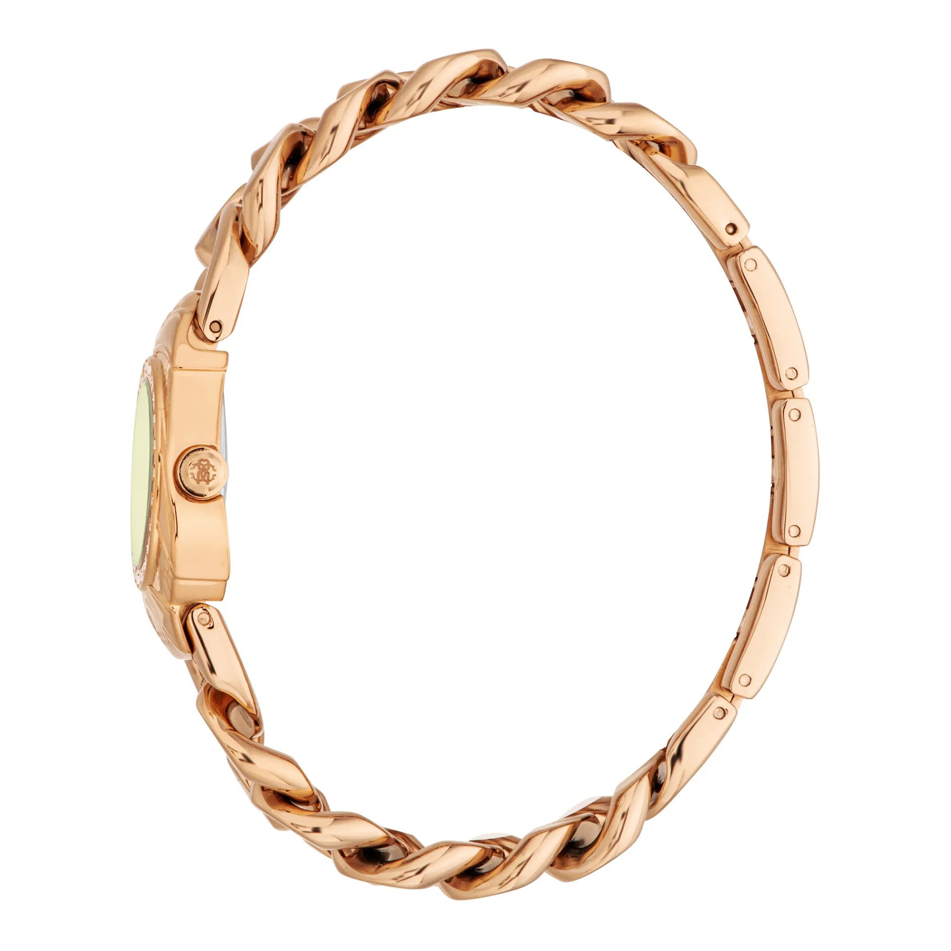 Poczuj urok zegarka Roberto Cavalli Lady w kolorze różowego złota. Jego nieregularna koperta i oliwkowo-zielona tarcza tworzą harmonijne połączenie elegancji i stylu. Bransoleta ze stali nierdzewnej i zapięcie jubilerskie oferują luksusowe wykończenie, a wodoodporność zapewnia praktyczność. Ten zegarek jest świadectwem ponadczasowego piękna.