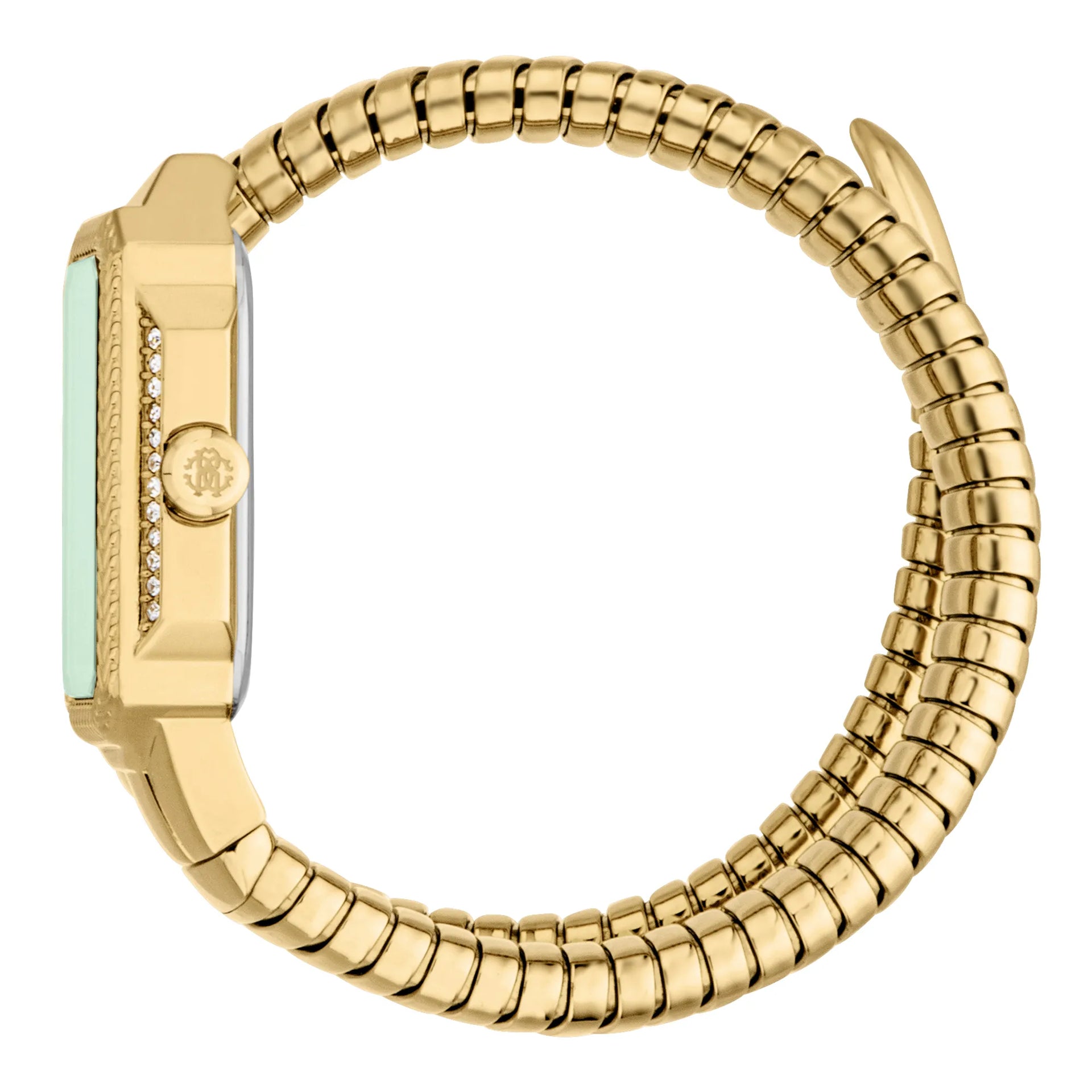 Doświadcz uroku zegarka Lady Roberto Cavalli, gdzie prostokątna koperta i bransoleta w kolorze żółtego złota spotykają się z butelkowo zieloną tarczą. Ten wodoodporny czasomierz, wyposażony w mineralne szkło, jest świadectwem zaangażowania marki w elegancję i modny design.
