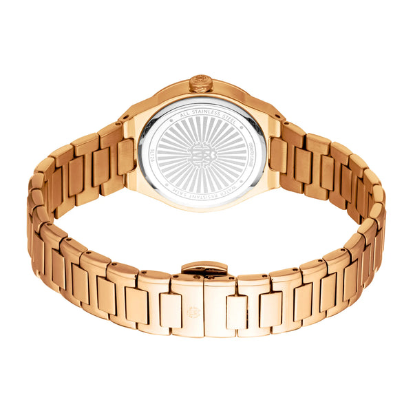 W świecie mody, gdzie elegancja spotyka się z innowacją, pojawia się zegarek, który ucieleśnia istotę wyrafinowania i stylu. Wykonany w sercu szwajcarskiego zegarmistrzostwa, ten zegarek Roberto Cavalli Lady jest świadectwem wyrafinowanego designu i doskonałego rzemiosła. Jego okrągła koperta, skąpana w ciepłym blasku różowego złota, łapie światło przy każdym ruchu, tworząc hipnotyzujący taniec refleksów. Z średnicą koperty 30 mm, siedzi z gracją na nadgarstku, będąc idealnym towarzyszem nowoczesnej kobiety, która ceni zarówno formę, jak i funkcję. Mineralne szkło chroni srebrno-szary cyferblat, płótno subtelności i wdzięku, gdzie trzy wskazówki poruszają się bez wysiłku, napędzane precyzją mechanizmu kwarcowego z kalibrem GL32. Bransoleta ze stali nierdzewnej, również w różowym złocie, owija się wokół nadgarstka z poczuciem ciągłości i harmonii, zabezpieczona zapięciem motylkowym z przyciskiem dla wygody i bezpieczeństwa. Wodoodporny do 50 metrów, ten zegarek to nie tylko modowy manifest, ale niezawodny partner w życiowych przygodach. Koronka typu pull & push dodaje praktyczności, umożliwiając łatwe regulacje. Ten zegarek Roberto Cavalli Lady to więcej niż dodatek, to celebracja kobiecości i stylu, element, który przemawia do serca tych, którzy odważają się objąć elegancję w każdej chwili.