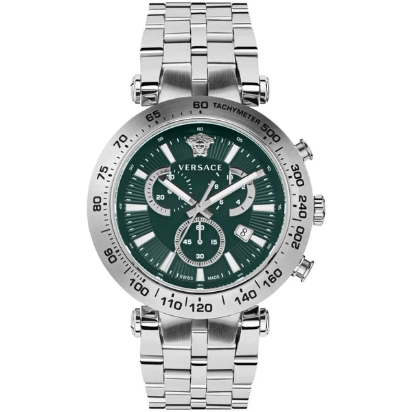 W świecie wysokiej mody, gdzie elegancja spotyka się z precyzją, pojawia się zegarek, który ucieleśnia istotę wyrafinowania i stylu. Wykonany w Szwajcarii, ten zegarek Versace jest świadectwem zaangażowania marki w doskonałość i luksus. Jego okrągła koperta o wyrafinowanym srebrno-szarym odcieniu przyciąga uwagę imponującą średnicą 46 mm, czyniąc go odważnym akcentem na każdym nadgarstku. Butelkowozielona tarcza, przypominająca bujne lasy, dodaje nutę tajemniczości i głębi, doskonale uzupełniona przez błyszczącą srebrno-szarą stalową bransoletę. Ten zegarek to nie tylko estetyka, posiada szafirowe szkło, które zapewnia klarowność i trwałość, a koronka typu pull & push oferuje płynną funkcjonalność. Z wodoodpornością do 50 metrów jest tak wszechstronny, jak stylowy. Motylkowe zapięcie z przyciskiem zapewnia pewne dopasowanie, czyniąc go niezawodnym towarzyszem na każdą okazję. Wyświetlacz chronografu, napędzany precyzyjnym mechanizmem kwarcowym, to ukłon w stronę potrzeb nowoczesnego mężczyzny, łączącego formę z funkcją. Funkcja kalendarza daty dodaje praktyczności jego urokowi, czyniąc go niezbędnym dodatkiem dla modnego dżentelmena. Ten zegarek Versace to więcej niż tylko czasomierz, to symbol wyrafinowanego designu i ponadczasowej elegancji, przeznaczony, by pozostawić trwałe wrażenie.