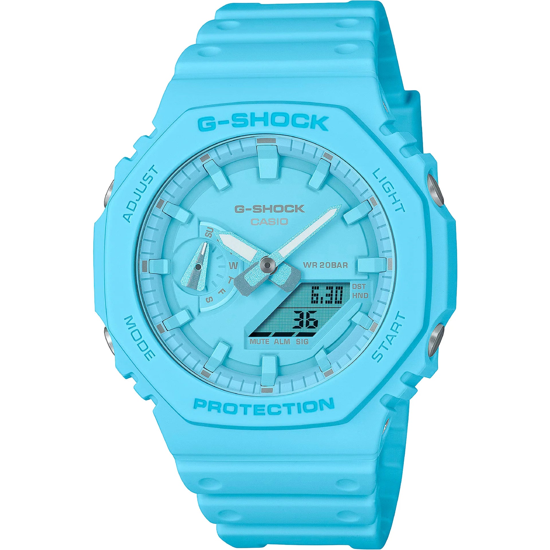 W tętniącym życiem świecie zegarków, gdzie funkcjonalność spotyka się z stylem, pojawia się zegarek, który ucieleśnia ducha przygody i puls nowoczesności. Wykonany w sercu innowacji, ten Casio G-Shock jest świadectwem dynamicznego stylu życia współczesnego mężczyzny. Jego okrągła koperta, skąpana w uderzającym turkusowym odcieniu, oddaje istotę głębin oceanu i nieograniczonego nieba. Dzięki wyrafinowanemu designowi, który obiecuje trwałość, ten zegarek to nie tylko dodatek, ale towarzysz każdej podróży. Turkusowy pasek z żywicy, płynnie łączący się z kopertą, owija nadgarstek z obietnicą komfortu i stylu, zabezpieczony niezawodną sprzączką. Cyfrowy wyświetlacz, umieszczony na pasującej turkusowej tarczy, jest płótnem precyzji, oferującym kompleksowy kalendarz obejmujący dzień, datę, miesiąc i rok. Napędzany mechanizmem kwarcowym o kalibrze 5611, zapewnia dokładność w każdym tyknięciu. Ten zegarek to nie tylko odmierzanie czasu, to jego opanowanie. Dzięki funkcjom takim jak chronograf, alarm, timer i czas światowy, spełnia wieloaspektowe wymagania współczesnego mężczyzny. Mineralne szkło chroni tarczę, podczas gdy koronka typu pull & push zapewnia łatwość regulacji. Wodoodporny do 100 metrów, zachęca do odkrywania nieznanego, zarówno na lądzie, jak i pod falami. A gdy słońce zachodzi, wbudowane światło zapewnia, że czas pozostaje twoim sprzymierzeńcem, oświetlając twoją drogę w najciemniejszych godzinach. Ten Casio G-Shock to więcej niż zegarek, to wyraz odwagi i celebracja żywego, inspirowanego popem stylu, który definiuje dzisiejszego ducha przygody.