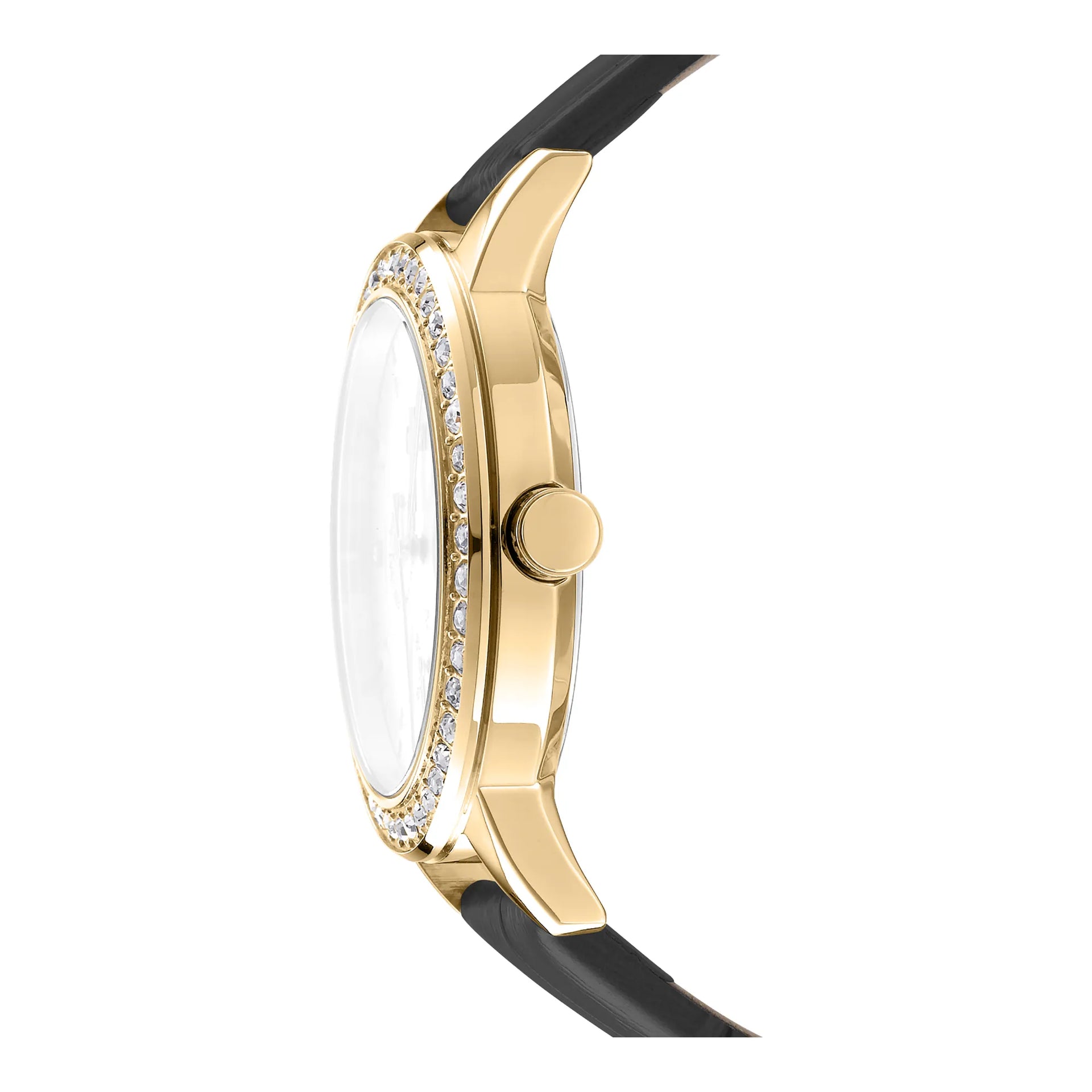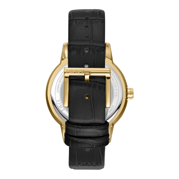 DKNY Parsons Multi Glitz w żółtym złocie to olśniewający hołd dla współczesnej mody. Jego 40mm okrągła koperta i czarna tarcza są połączone z eleganckim czarnym skórzanym paskiem, tworząc efektowny kontrast. Wodoodporny do 50 metrów, ten zegarek jest idealny dla tych, którzy odważają się wyróżniać.
