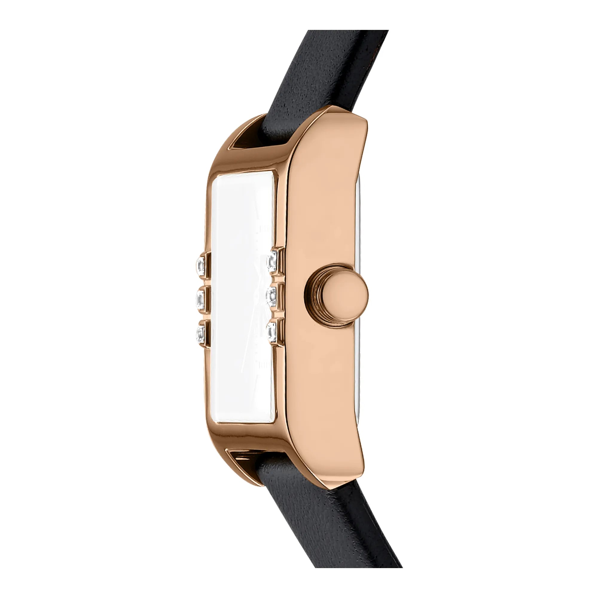 W tętniącym życiem sercu miasta, gdzie moda spotyka się z funkcjonalnością, pojawia się zegarek, który ucieleśnia istotę miejskiej elegancji. Zegarek DKNY DK1L008 Westside Glitz jest świadectwem wyczucia stylu i wyrafinowania nowoczesnej kobiety. Jego prostokątna koperta, skąpana w luksusowym odcieniu różowego złota, łapie światło przy każdym ruchu, tworząc urzekający taniec refleksów. Mierzący delikatne 22 mm średnicy, ten zegarek jest idealnym towarzyszem dla tych, którzy cenią subtelność i grację. Czarny skórzany pasek, zabezpieczony klasyczną sprzączką, wygodnie owija się wokół nadgarstka, oferując zarówno komfort, jak i odrobinę ponadczasowego szyku. Czarna tarcza, płótno tajemnicy i uroku, ozdobiona jest trzema wskazówkami napędzanymi precyzyjnym mechanizmem kwarcowym, zapewniając, że czas zawsze jest po twojej stronie. Mineralne szkło chroniące jej powierzchnię sprawia, że zegarek jest tak trwały, jak piękny, gotowy wytrzymać trudy codziennego życia. Wodoodporny, stoi niewzruszenie wobec niespodzianek, czyniąc go idealnym dodatkiem na każdą okazję. DKNY Westside Glitz to nie tylko zegarek, to wyraz wyrafinowanego designu i współczesnego uroku, stworzony dla kobiety, która wie, że prawdziwy styl tkwi w szczegółach.