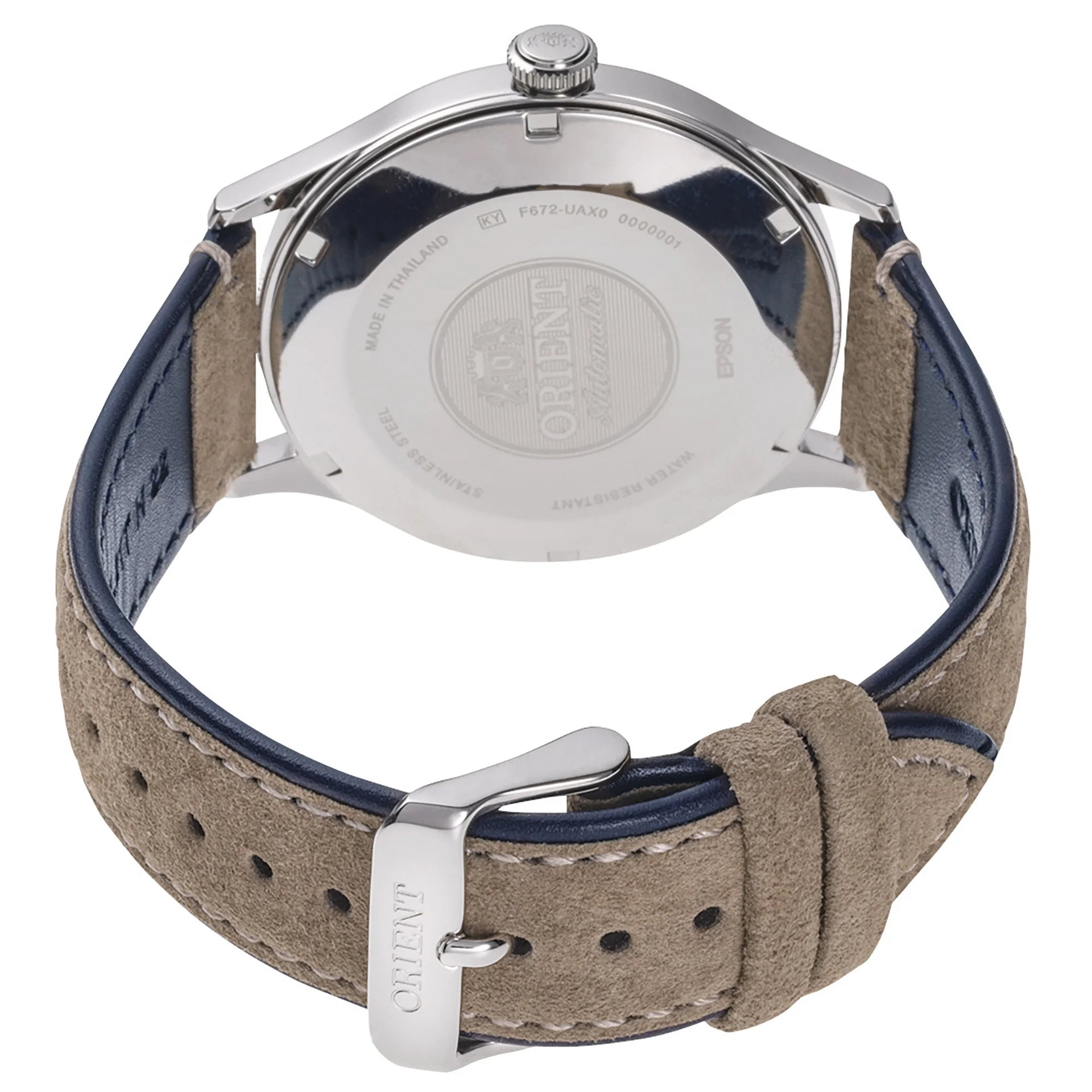 W królestwie ponadczasowej elegancji, ORIENT AC0P Bambino V4 wyłania się jako symbol wyrafinowania i stylu. Wykonany z precyzją, ten zegarek ORIENT Classic jest świadectwem sztuki zegarmistrzowskiej, zaprojektowany dla nowoczesnego mężczyzny, który docenia drobne przyjemności życia. Jego okrągła koperta, utrzymana w eleganckim srebrno-szarym odcieniu, ma imponującą średnicę 42 mm, emanując wyrafinowaną obecnością na nadgarstku. Mineralne szkło chroni hipnotyzującą tarczę w nocnym niebieskim kolorze, przypominającą gwiaździste niebo, po której trzy wskazówki z gracją przesuwają się, oznaczając upływ czasu z łatwością i wdziękiem. Beżowy skórzany pasek, zabezpieczony klamrą na szpilkę, dodaje odrobinę swobodnej elegancji, czyniąc go idealnym towarzyszem na każdą okazję. Pod jego wykwintnym wyglądem kryje się serce zegarka — mechaniczny mechanizm napędzany kalibrem F6724, wyposażony w 22 kamienie i oferujący zarówno nakręcanie ręczne, jak i automatyczne. Z codzienną dokładnością +25/-15, ten czasomierz zapewnia precyzję w każdej chwili. Funkcja kalendarza daty dodaje praktyczności jego urokowi, podczas gdy koronka typu pull & push umożliwia łatwe regulacje. Wodoodporny, ten zegarek jest gotowy towarzyszyć Ci w życiowych przygodach, czy to podczas poruszania się po miejskiej dżungli, czy relaksującego dnia nad wodą. ORIENT AC0P Bambino V4 to nie tylko zegarek, to wyraz wyrafinowanego gustu i ponadczasowego stylu, prawdziwy towarzysz dla wymagającego dżentelmena, który ceni zarówno formę, jak i funkcję w codziennym życiu.