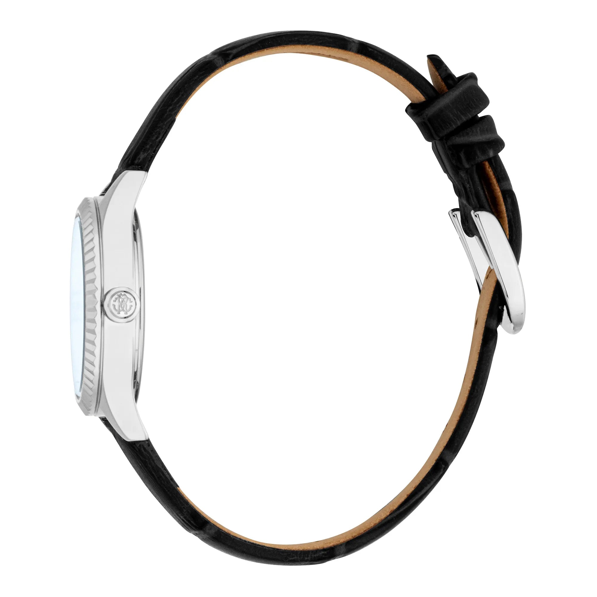Jasnoniebieski łączy się z szarym srebrem w tym zegarku damskim Roberto Cavalli, delikatna równowaga między elegancją a nowoczesnością. Okrągła koperta o średnicy 28 mm i czarny skórzany pasek, zapinany na sprzączkę, oferują wyrafinowany akcent. Dzięki wodoodporności WR 50mt jest tak praktyczny, jak i piękny.