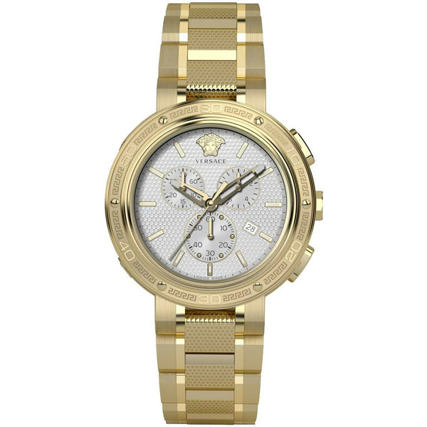 Poczuj przepych Versace dzięki temu efektownemu zegarkowi z żółtego złota, gdzie moda spotyka się z precyzją. Okrągła koperta o średnicy 46 mm i dopasowana bransoleta ze stali nierdzewnej emanują luksusem, podczas gdy biała tarcza i szafirowe szkło oferują ponadczasową elegancję. Wodoodporny do 50 metrów, jest wyrazem stylu i wyrafinowania.
